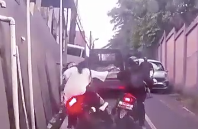 Rekaman juga menunjukkan sejumlah pengendara motor yang terpaksa mengerem mendadak dan salah satunya sempat tergelincir ke selokan atau parit saat berusaha menghindari pikap yang berhenti di jalur.