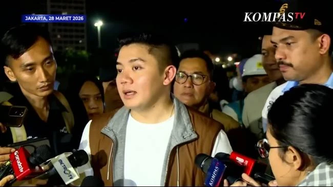 Sekretaris Kabinet (Seskab) Teddy Indra Wijaya bersama Menteri UMKM Maman Abdurrahman di kawasan Monas, Jakarta, Sabtu (28/3/2026). (Sumber: Tangkap layar KompasTV.)